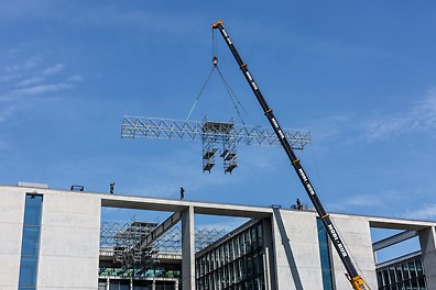 Die PERI UP Arbeitsplattform kann mit dem Kran an die richtige Position gesetzt werden. Die PERI UP Arbeitsplattform kann mit dem Kran an die richtige Position gesetzt werden.