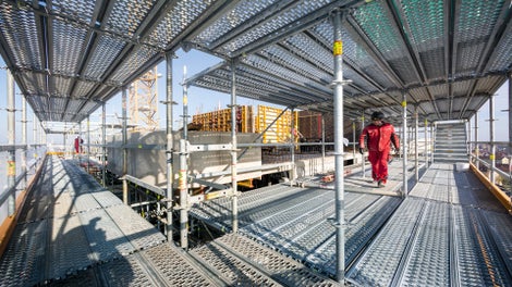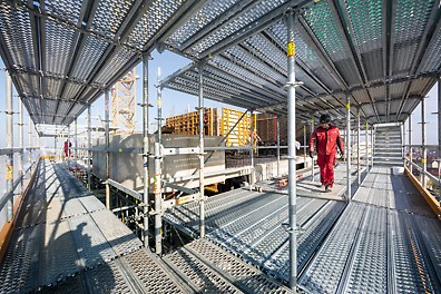 Anpassungen an die Gebäudeform erfolgen im einheitlichen Raster von 25 cm, das bietet hohe Flexibilität für komplexere Fassadeneinrüstungen. -