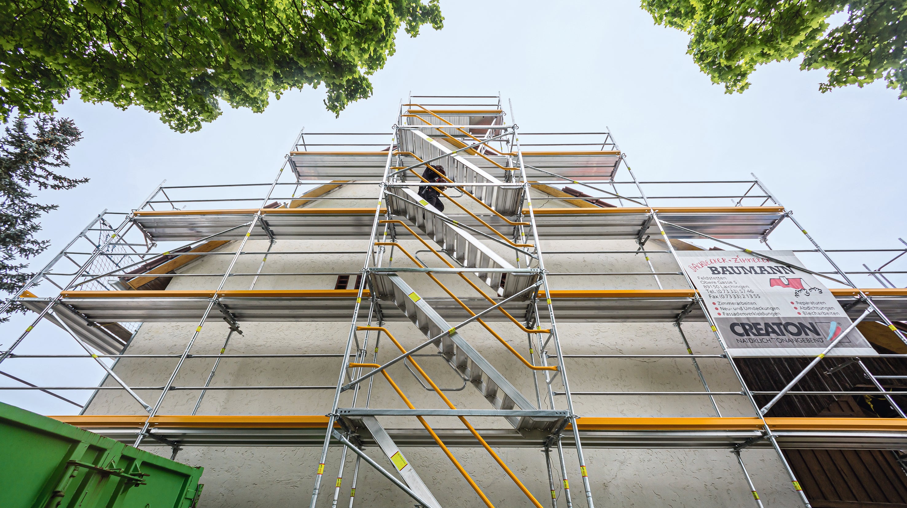 Leichte Bauteile, wenige Handgriffe und nahezu kupplungsfrei, ohne zusätzliche Rahmenzüge mit dem Fassadengerüst verbunden.