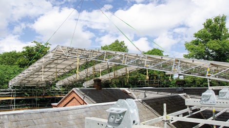 Montieren Sie die Bindereinheiten des PERI UP Wetterschutzdaches schnell und sicher vom Boden aus. Anschließend werden diese mit Hilfe eines Krans in Position gebracht. -