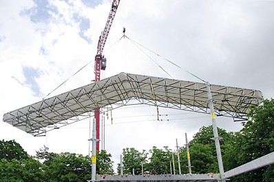 Montieren Sie die Bindereinheiten des PERI UP Wetterschutzdaches schnell und sicher vom Boden aus. Anschließend werden diese mit Hilfe eines Krans in Position gebracht. -