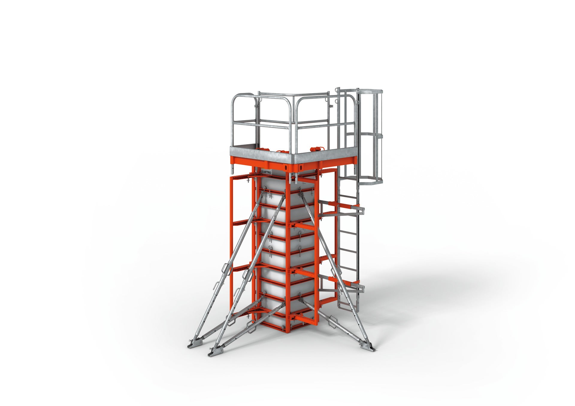 Die QUATTRO verfügt über eine Betonierplattform und einen fest integrierten Leiteraufstieg mit Rückenschutz. Beides verbleibt selbst beim Umsetzen an der Schalung.