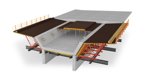 Mit dem VARIOKIT Taktschiebesystem VIL lassen sich Außen-, Innen- und Deckenschalungen von Brücken im Taktschiebeverfahren systematisch und wirtschaftlich herstellen. -