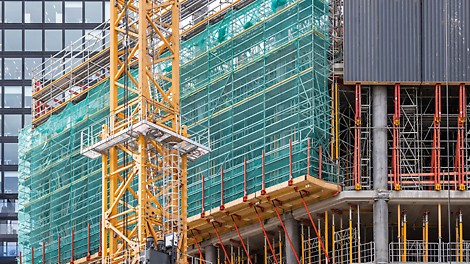 Rundum geschütztMit PERI Kletterschutzwänden wurden die Absturzkanten der oberen Geschosse der Türme lückenlos umschlossen. Das Personal war dadurch zu jeder Zeit gegen Absturz sowie vor herabfallenden Gegenständen gesichert und gleichzeitig vor starkem Wind geschützt.